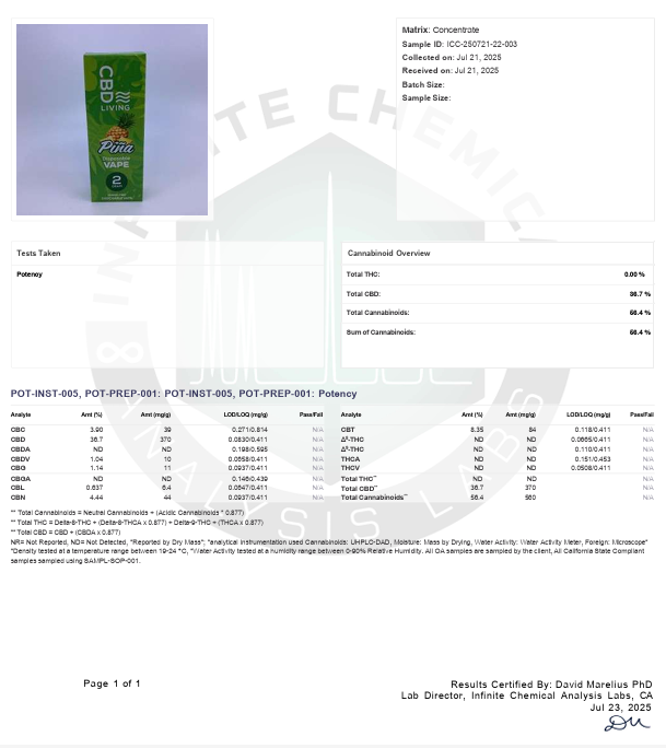 CBD Living CBD Vapes are a 2-gram Broad-Spectrum CBD vape with 500 mg Nano CBD. Smooth, flavorful, and THC-free, these vapes are perfect for on-the-go relief and convenient daily use.