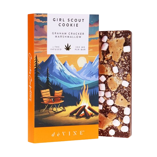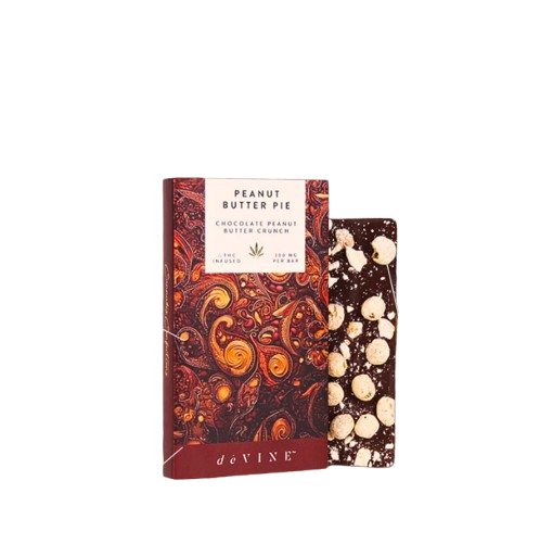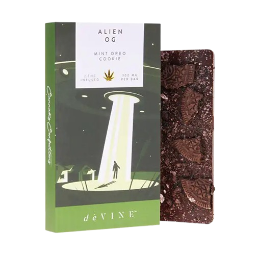 Enjoy the smooth taste and balanced effects of the DeVine D8 + D9 Chocolate, available in Alien OG, Girl Scout Cookie, and Peanut Butter Pie flavors, each with 150mg Delta 9 THC and 150mg Delta 8 THC.