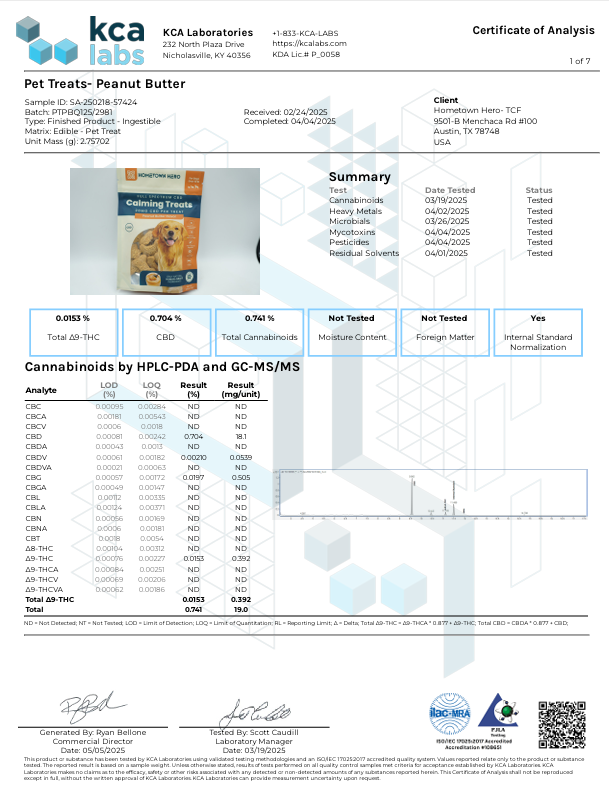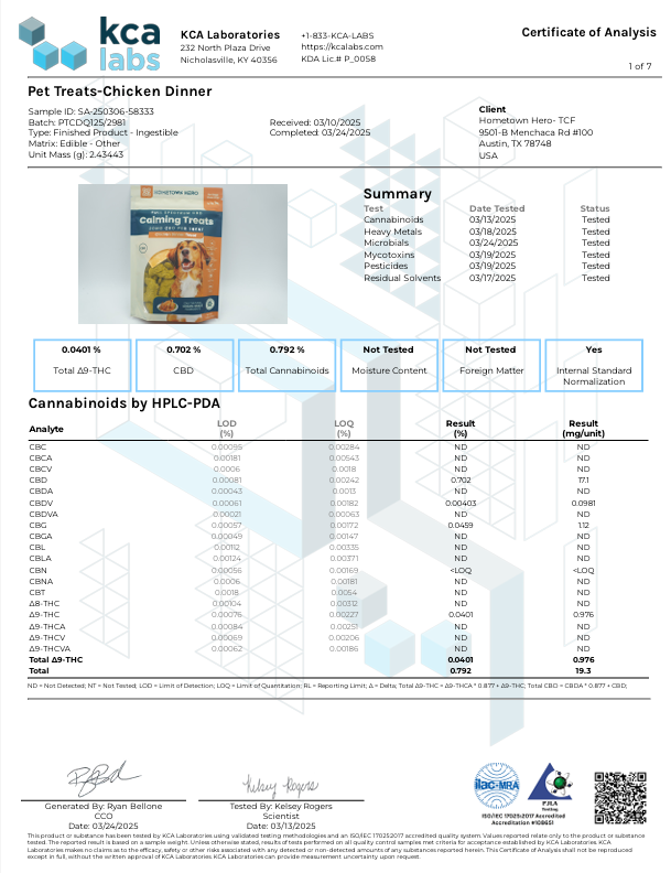 Crafted with human-grade ingredients and 20mg of full-spectrum CBD, Hometown Hero Dog Treats promote calm, comfort, and joint support for dogs 10 lbs and up.