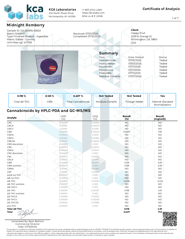 Midnight REMberry Gummies by Happy Fruit deliver 5mg THC, CBN, and CBNO with rosin and elderberry to support naturally sourced, restorative sleep.