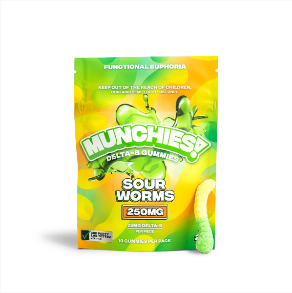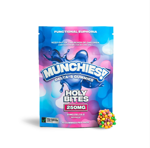 Munchies Delta 8 Gummies deliver 25mg of Delta-8 THC per piece in a 10-count bag, available in Holy Bites and Sour Worms flavors.