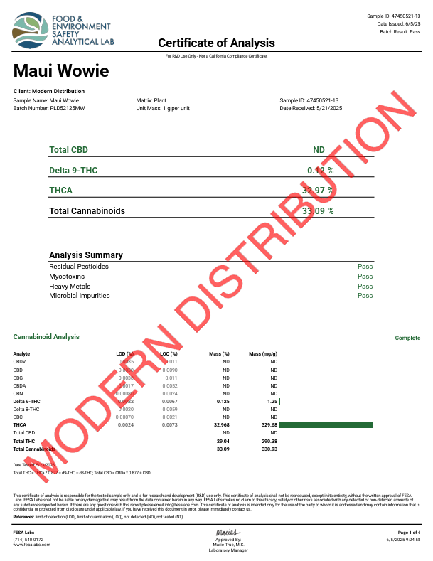 Maui Wowie grows best in warm, sunny environments but performs well indoors with proper care. Its resilient genetics make it easy to manage and rewarding to cultivate. Additionally, its buds are dense, colorful, and rich in trichomes, reflecting the strain’s quality and potency. Each batch of this THCa flower undergoes rigorous lab testing to ensure purity, consistency, and exceptional flavor.